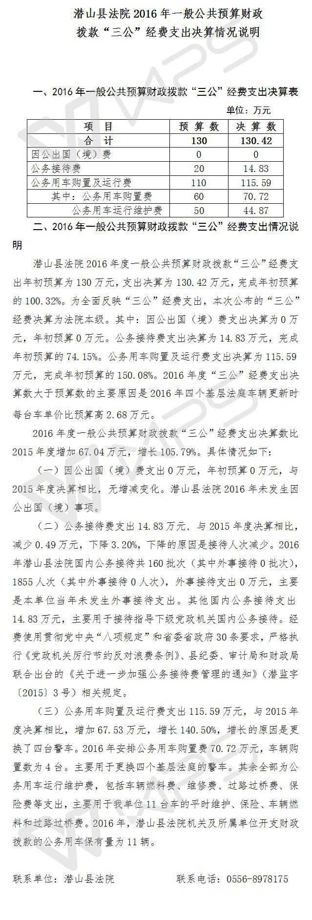 潜山县法院2016年一般公共预算财政拨款“三公”经费支出决算情况