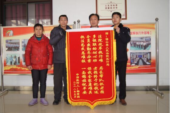 2018年1月9日,杨某及家人来到38365365备用网址执行局,送上一面印有“法院改革执行难,局长带队抓老赖;全员出勤齐办案,保我全家度难关”的锦旗,高度赞扬执行局高效执行办案,感谢执行团队尽心尽责为其将赔偿款执行到位。
